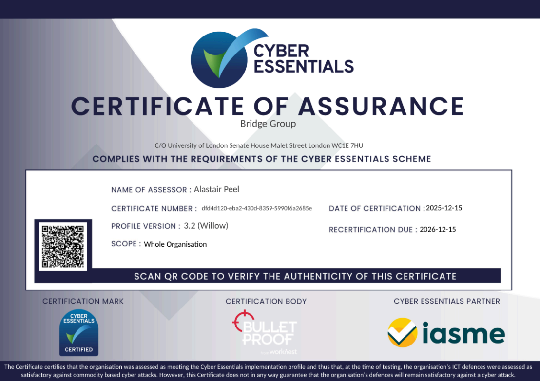 The Bridge Group has been reawarded Cyber Essentials and Cyber Essentials Plus certification. The government-backed scheme, led by the National Cyber Security Centre in association with the IASME consortium, aims to protect organisations against cyber attacks. The process includes both an online self-assessment and an independent audit of all Bridge Group systems and processes by a qualified assessor.